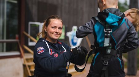 When you come to us, we start by putting on a harness and then we hold a safety review and then you get to walk the training track under the supervision of an instructor. Then you can climb freely in the park for the rest of your 2.5 hours.