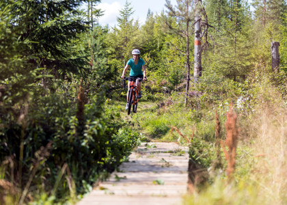 I grunden har vi våra fem-sex mil av cykelleder genom magisk terräng, så kallad traditionell stigcykling på lätt eller medelsvår nivå. Ifjol kunde vi även inviga vår flowtrail som blivit mycket populär. Det är en två kilometer lång stig intill stadion och upp mot isbjörnshägnet som man åker på. Det är inga uppbyggda hinder i den sträckningen utan bygger mer på fart och fläkt med doserade kurvor.